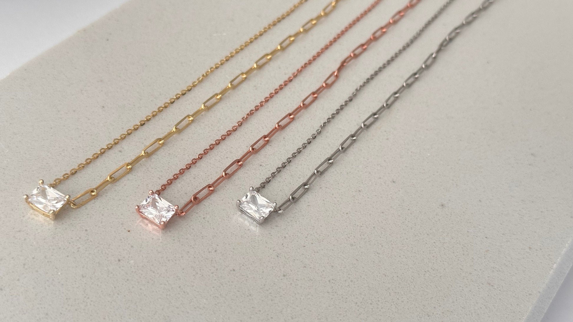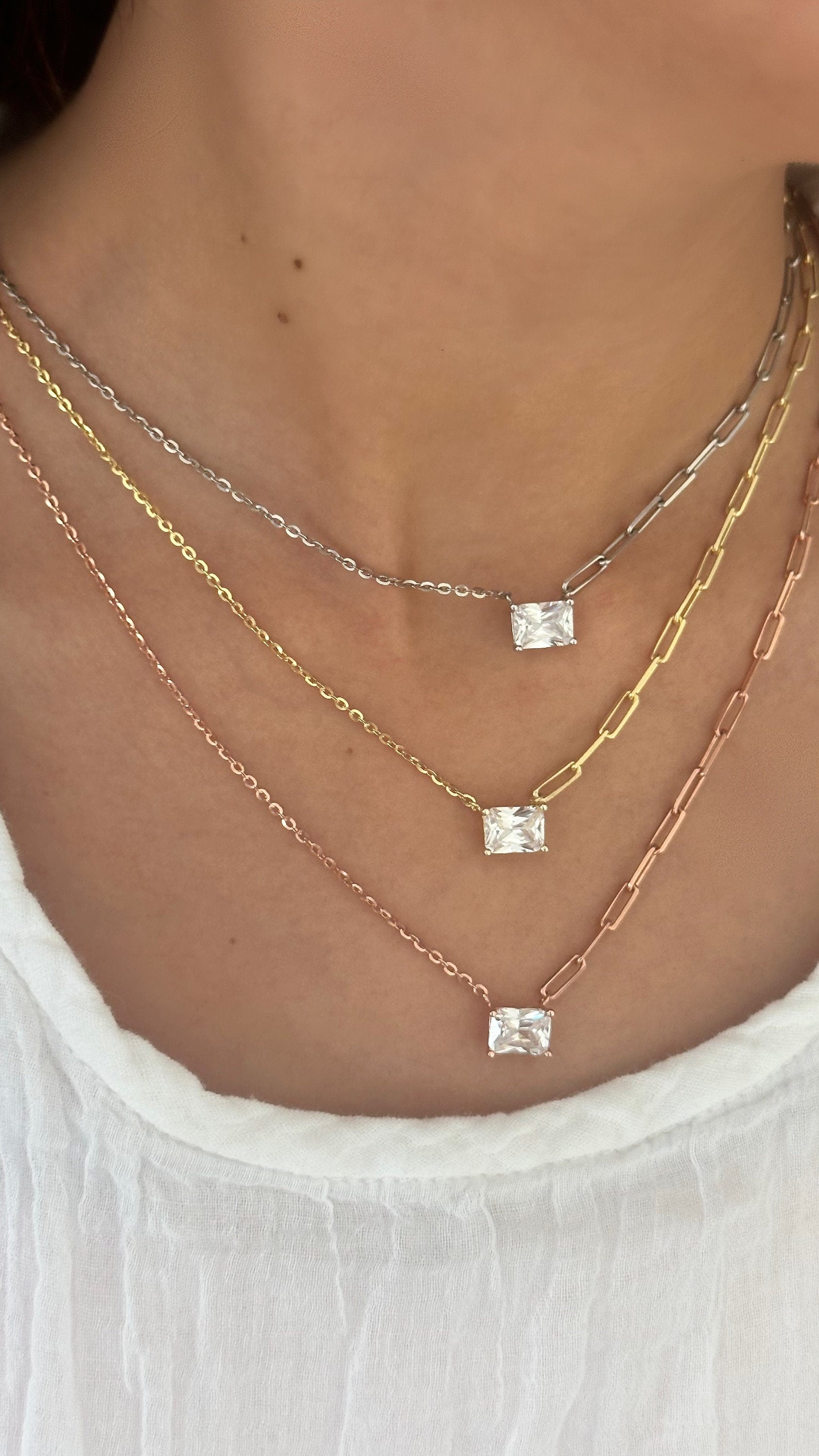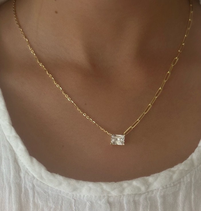 Baguette Necklace Crystal Diamond Shiny Zirconia Rectangle Stone Emerald Cut Pendant Necklace Layering Gift for her Baguette Jewelry 925
