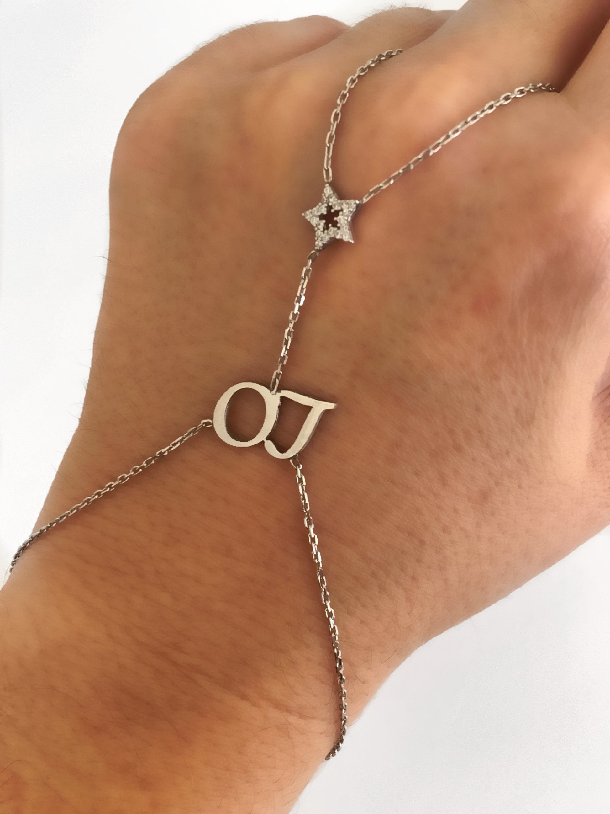 Custom Hand Chain Named bracelet with CZ stone, Personalized Initial Hand Bracelet, Name Ring Slave Bracelet, Personalized Gifts for her