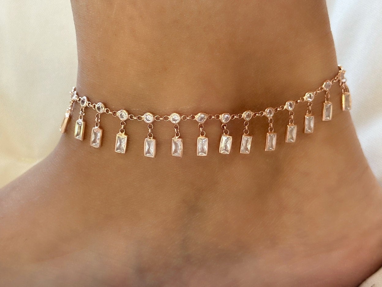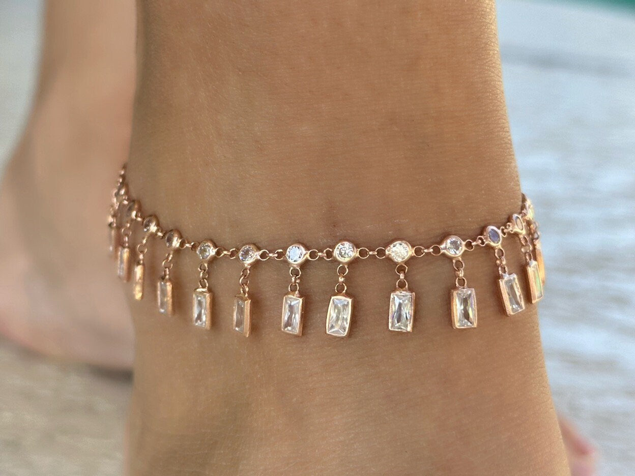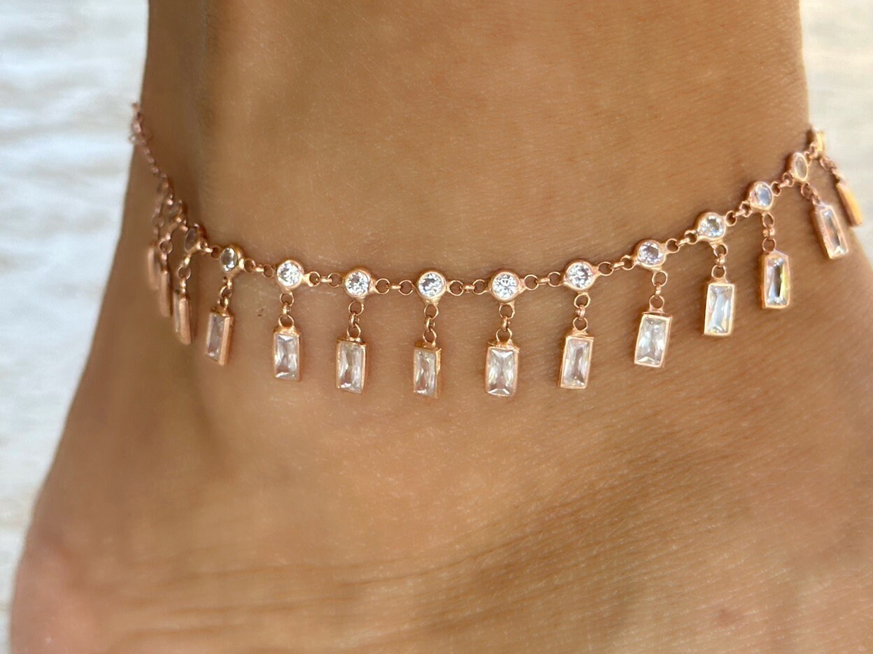 Dangle CZ Stone Anklet, Crystal Diamond Anklet, Dangle Gemstone Anklet, Summer gift, Beach Jewelry, 14K Rose gold Anklet, Ankle Bracelet