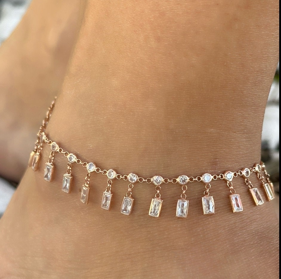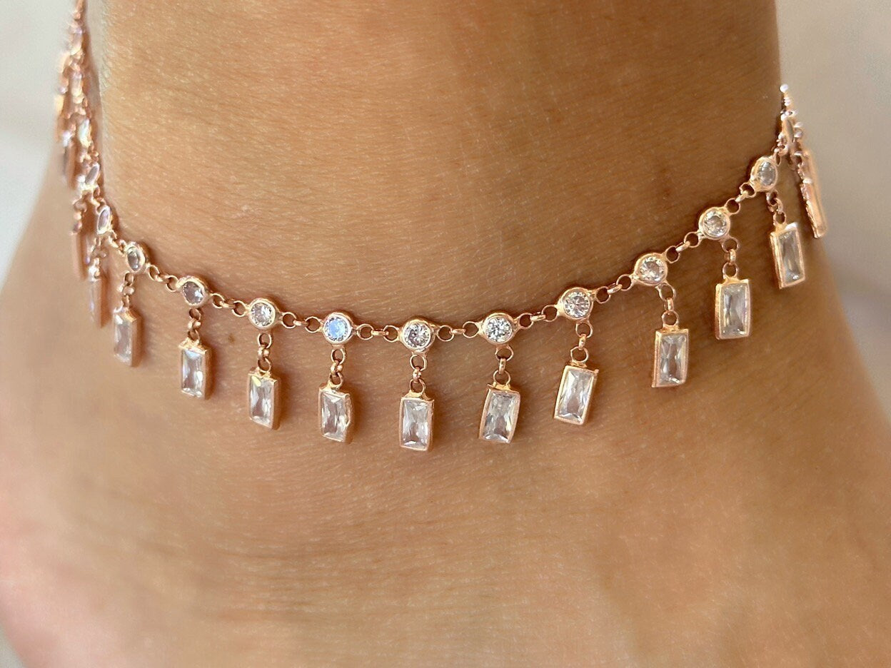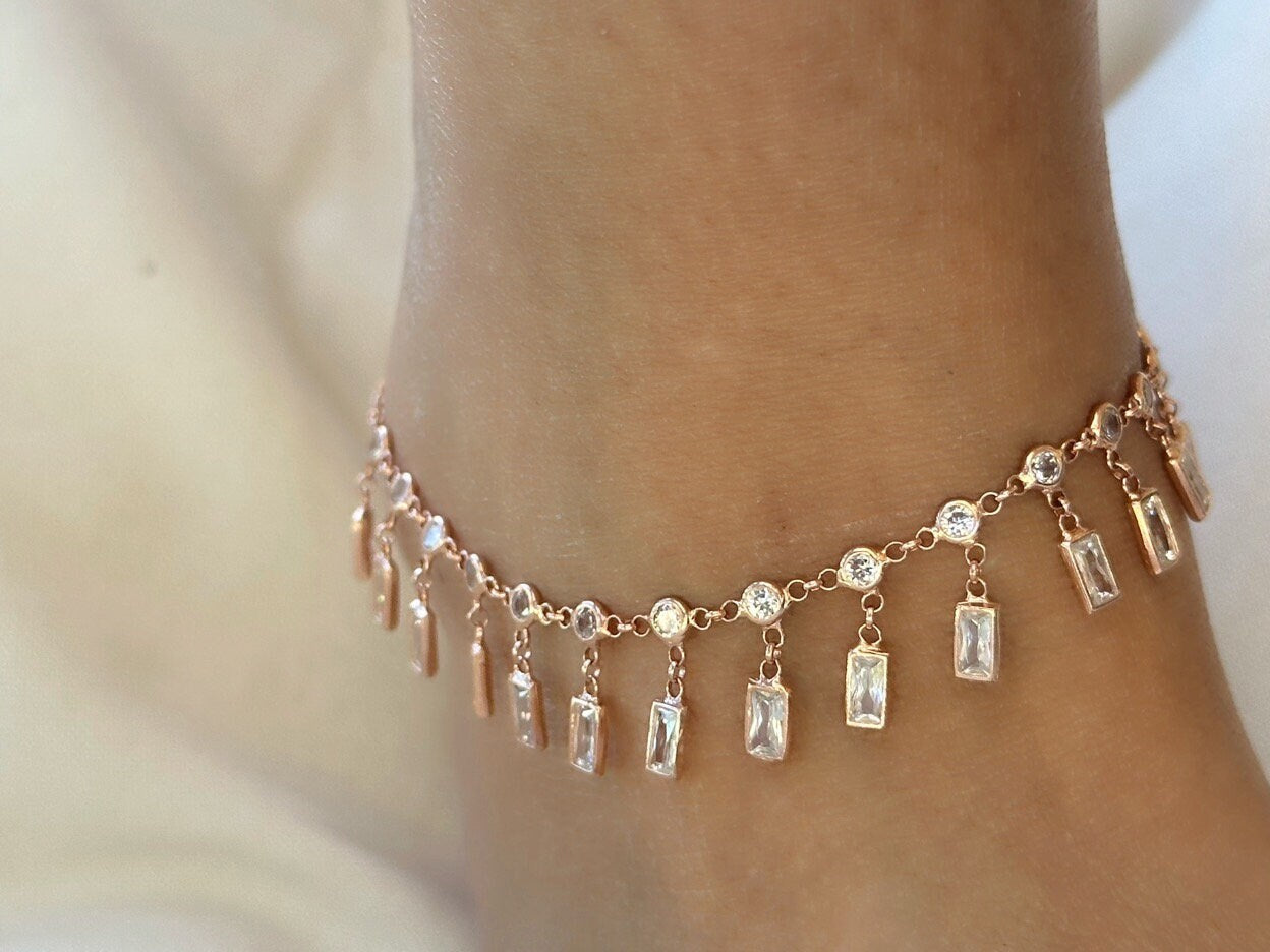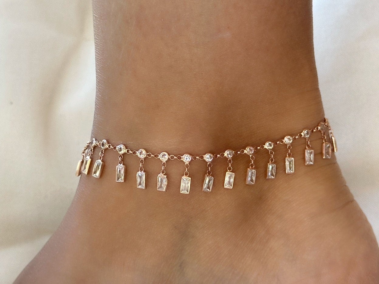 Dangle CZ Stone Anklet, Crystal Diamond Anklet, Dangle Gemstone Anklet, Summer gift, Beach Jewelry, 14K Rose gold Anklet, Ankle Bracelet