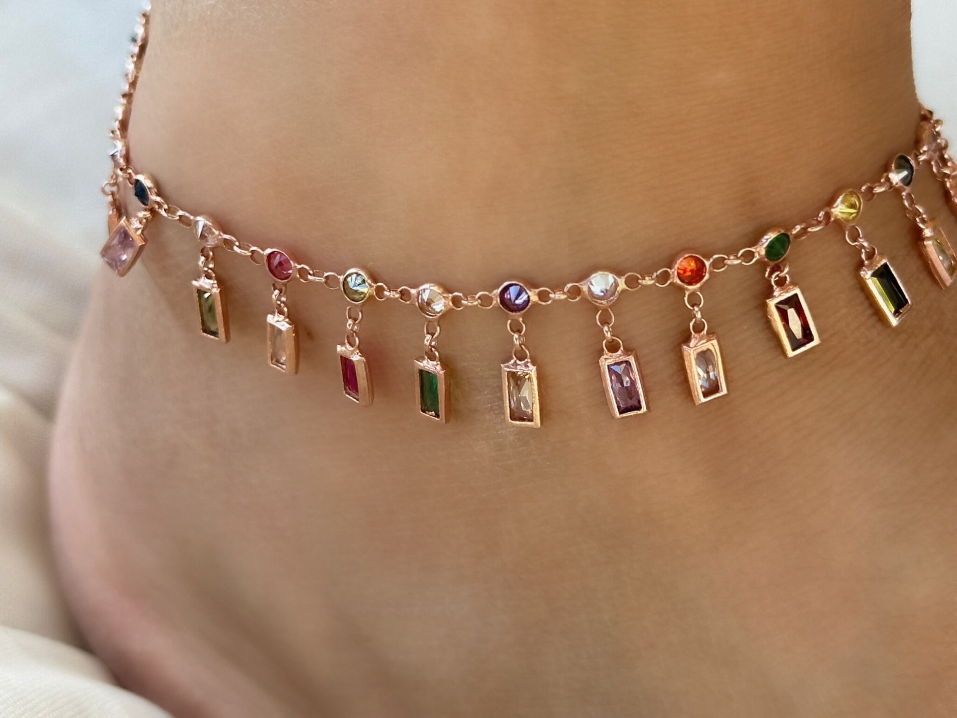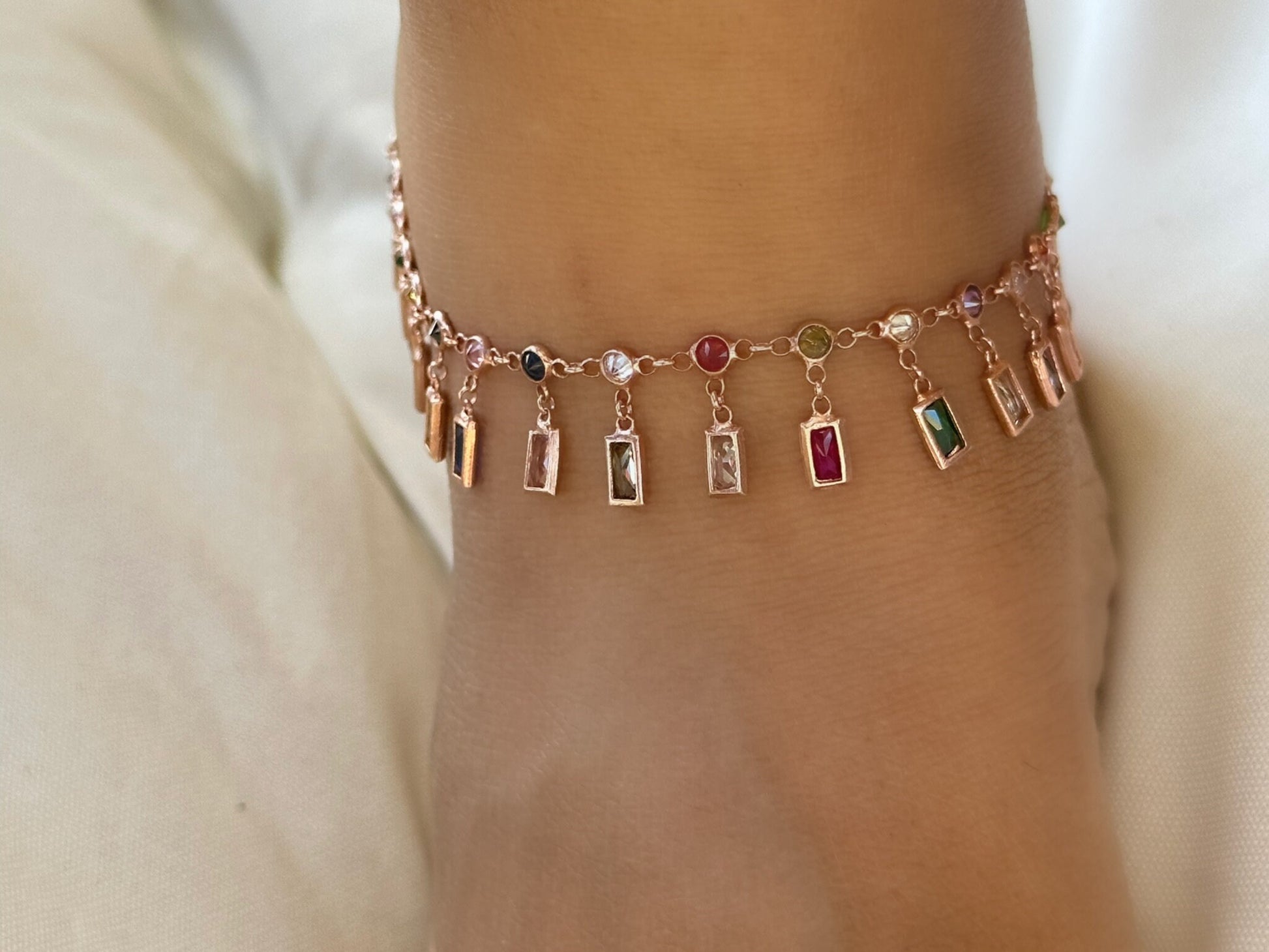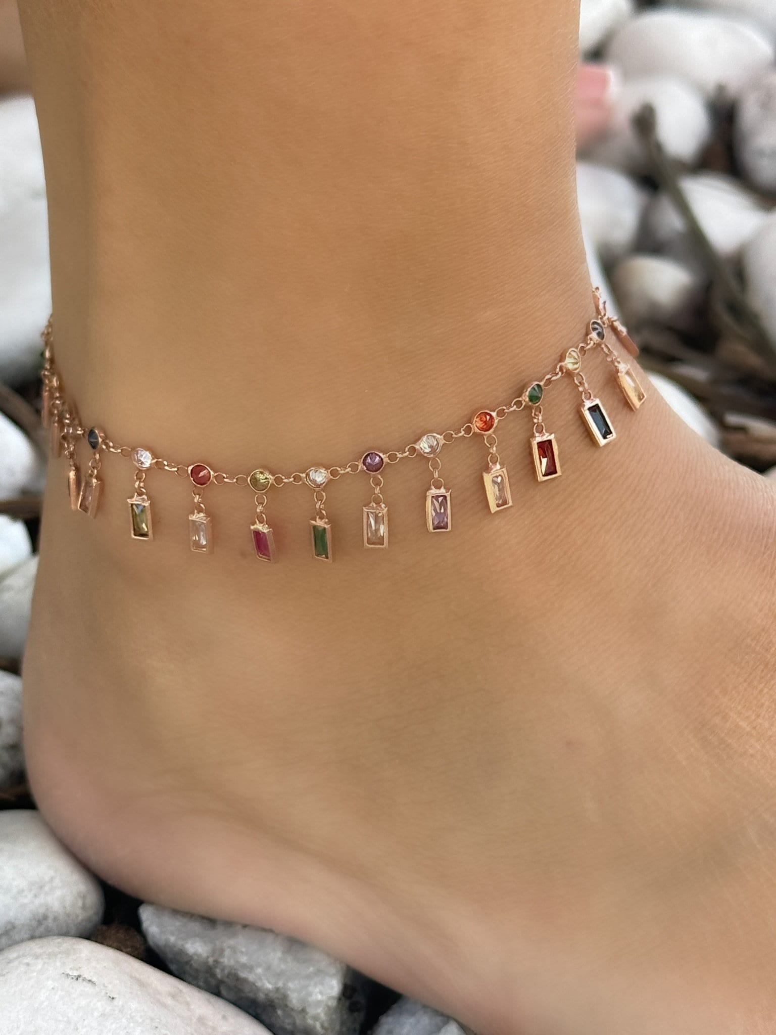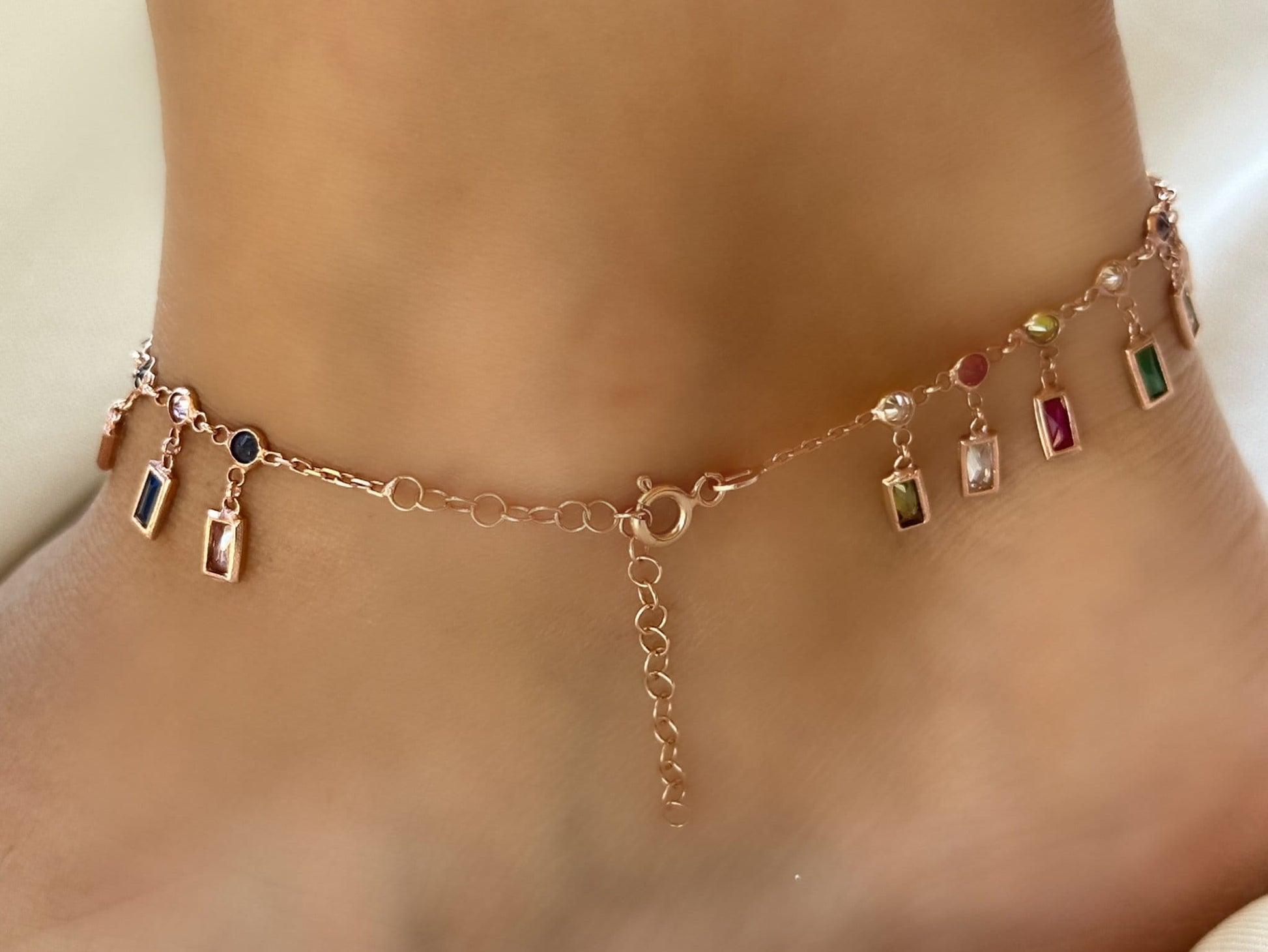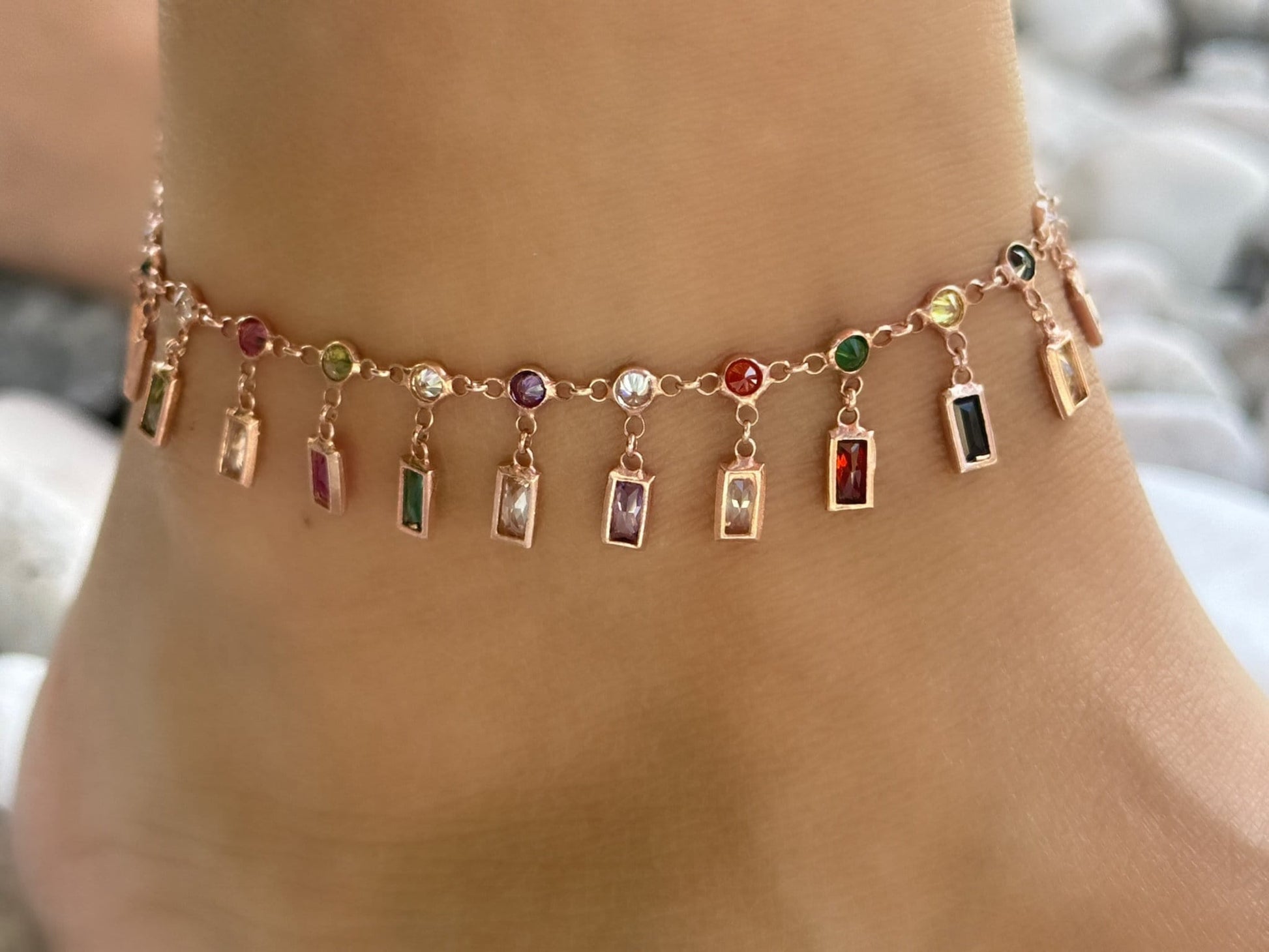 Dangle CZ Stone Anklet, Crystal Diamond Anklet, Dangle Gemstone Anklet, Summer gift, Beach Jewelry, 14K Rose gold Anklet, Ankle Bracelet