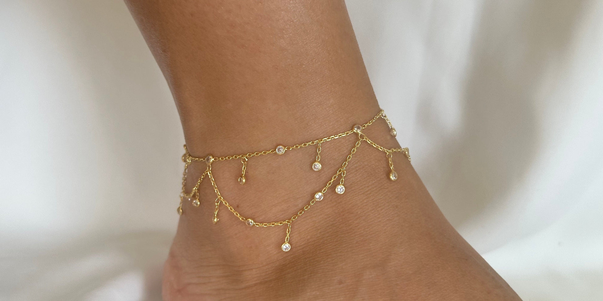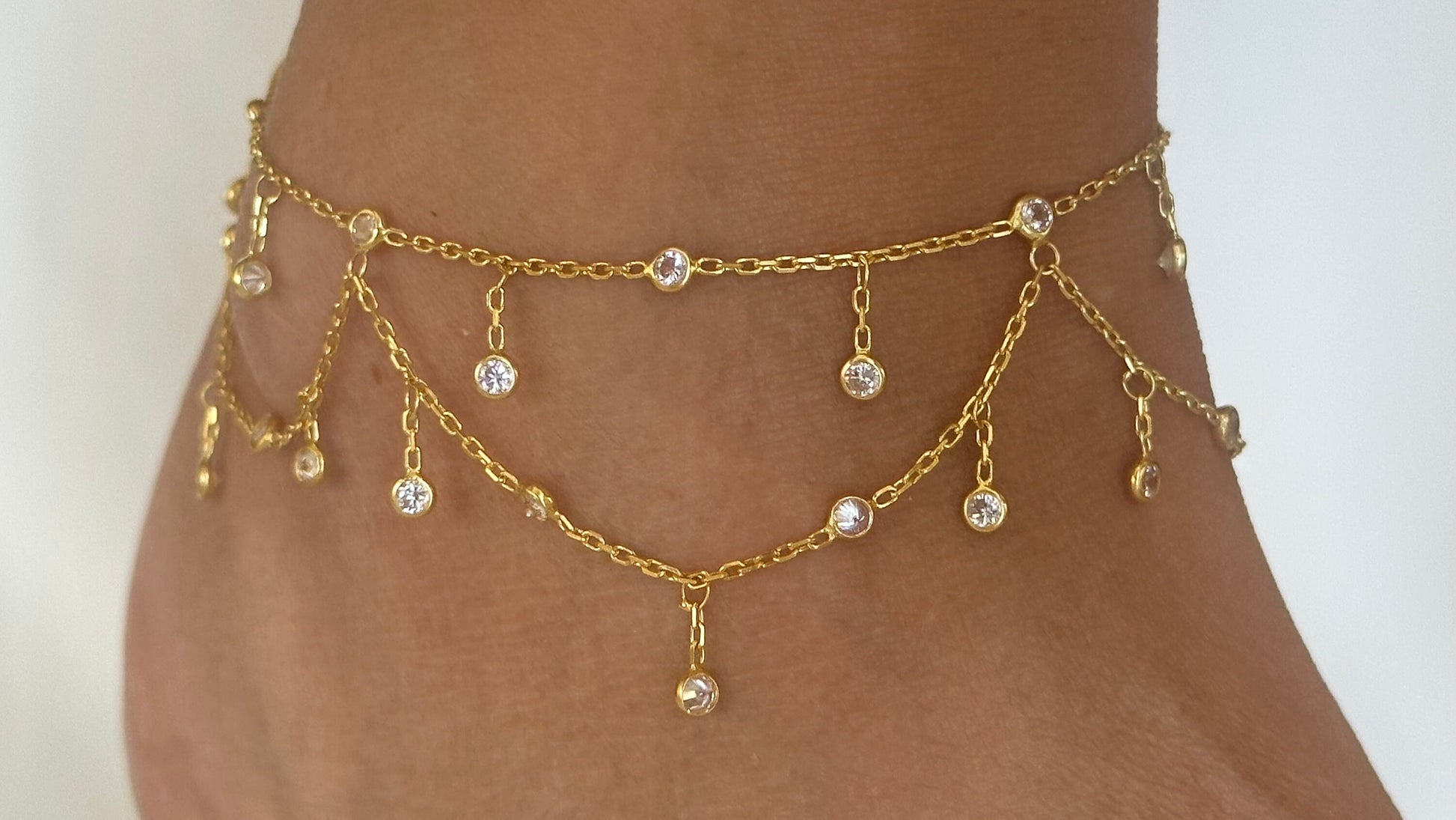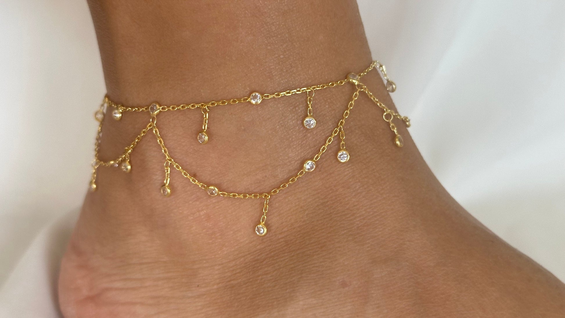 Dangle CZ Stone Anklet, Crystal Diamond Anklet, Dangle Gemstone Anklet, Summer gift, Beach Jewelry, 14K Rose gold Anklet, Ankle Bracelet