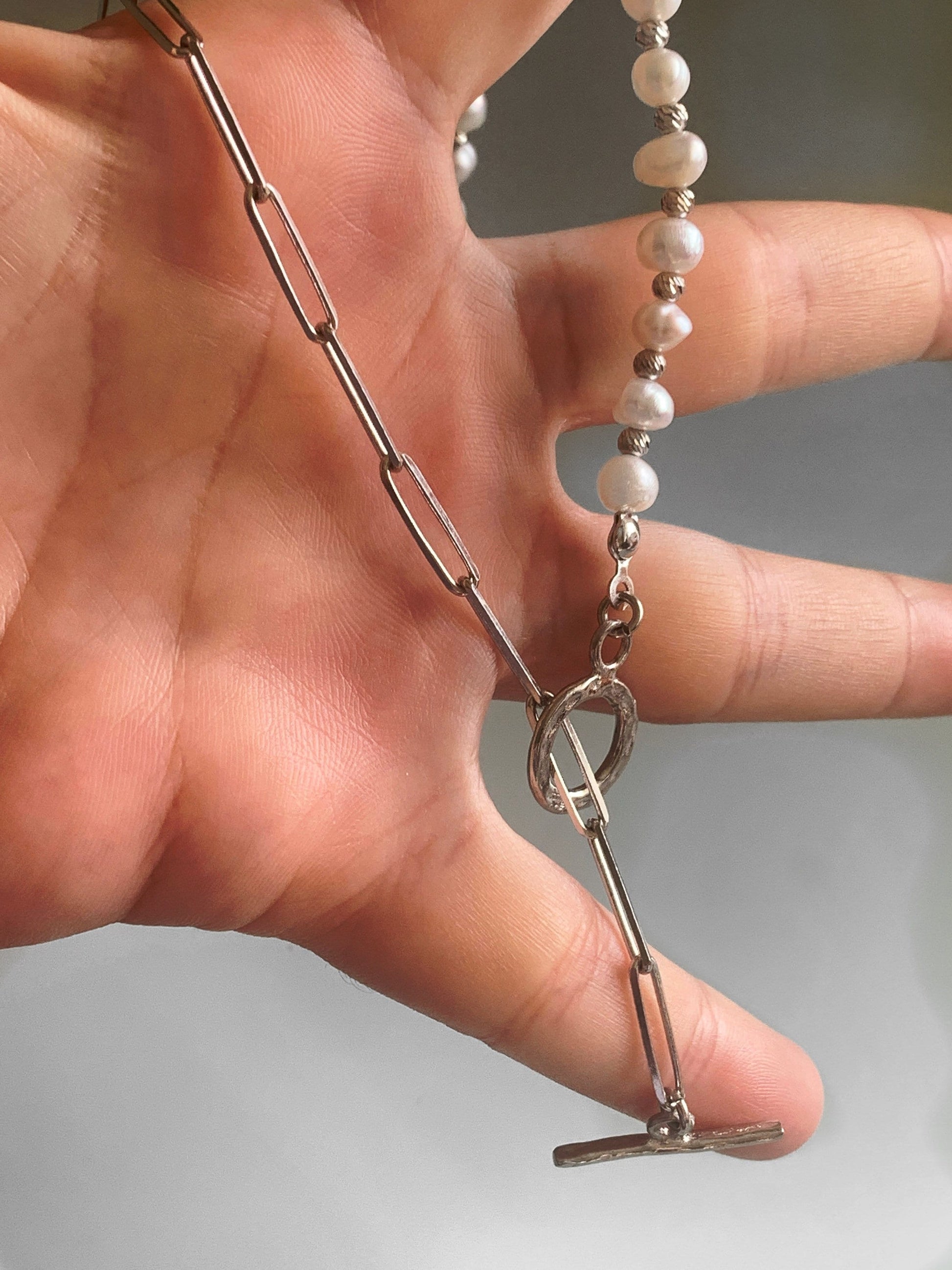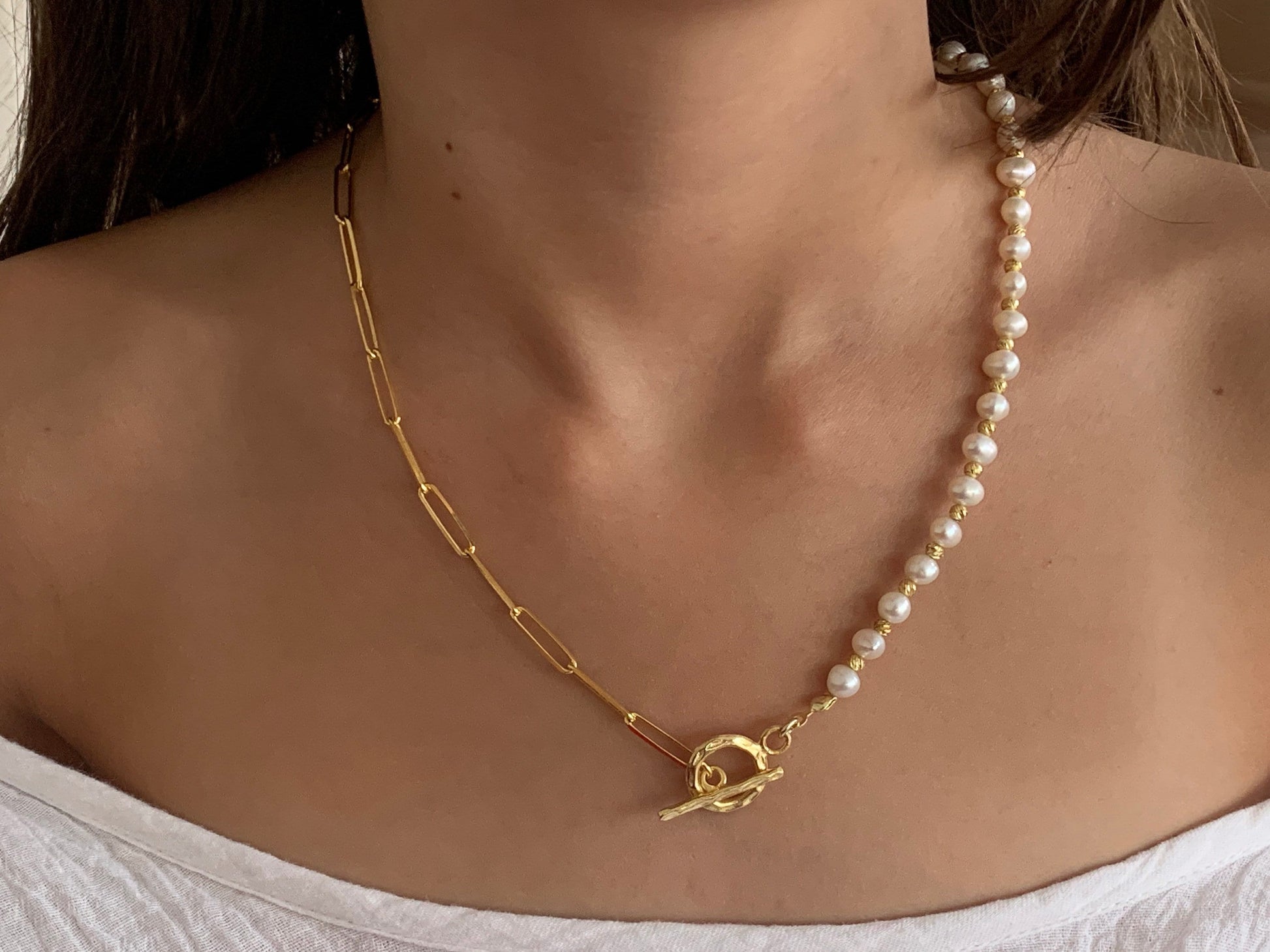 Half Pearl Necklace, Half Pearl Half Chain Necklace Pearl Choker, Gold Toggle Necklace, Paperclip Chain Necklace, Freshwater Pearl Chain