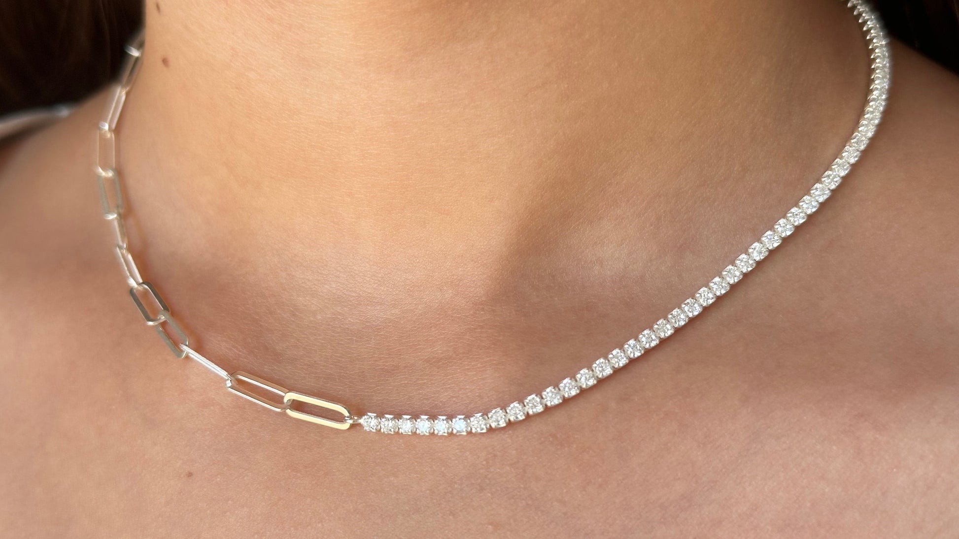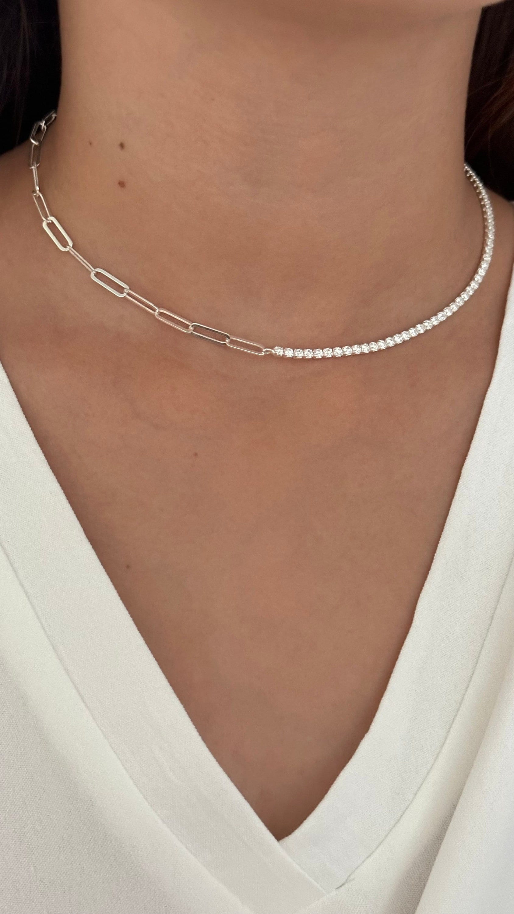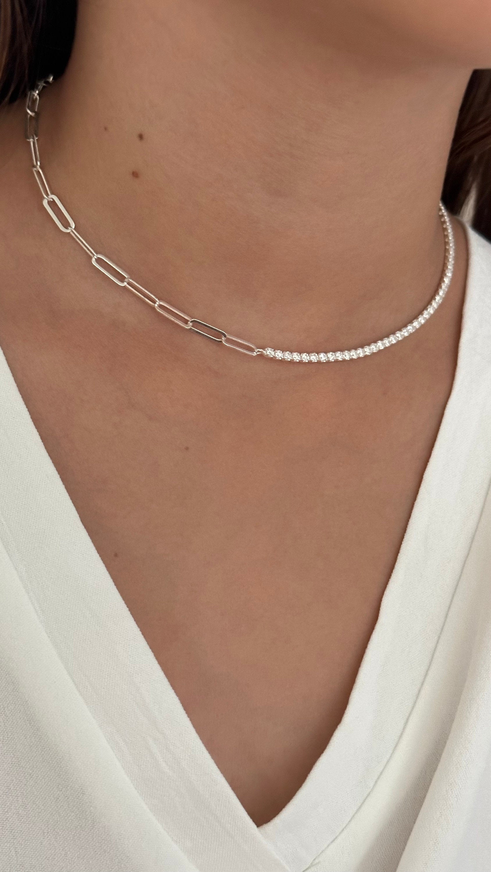 Half Tennis Half Link Chain Necklace Choker, CZ Tennis Necklace, 2mm Diamond Necklace, Link Chain Necklace, Tennis Jewelry, 925 Silver