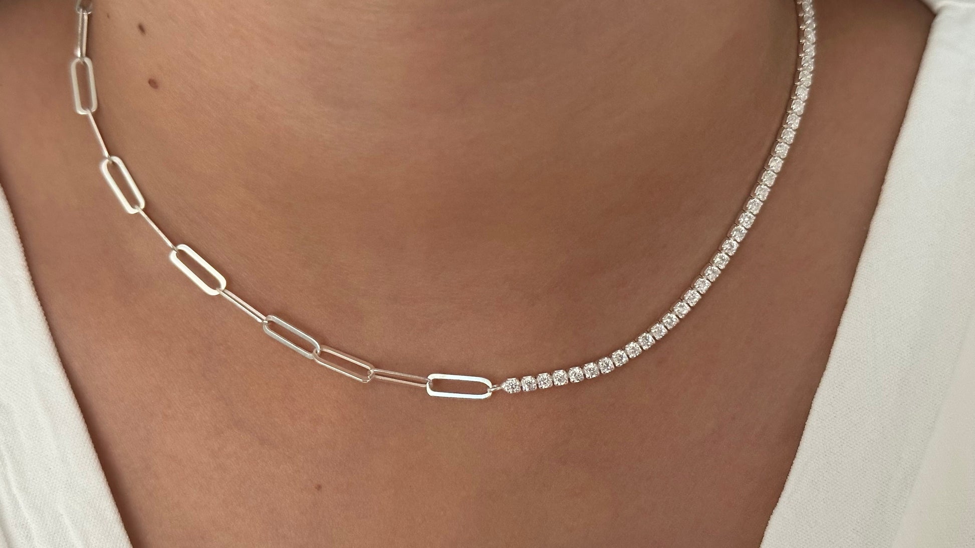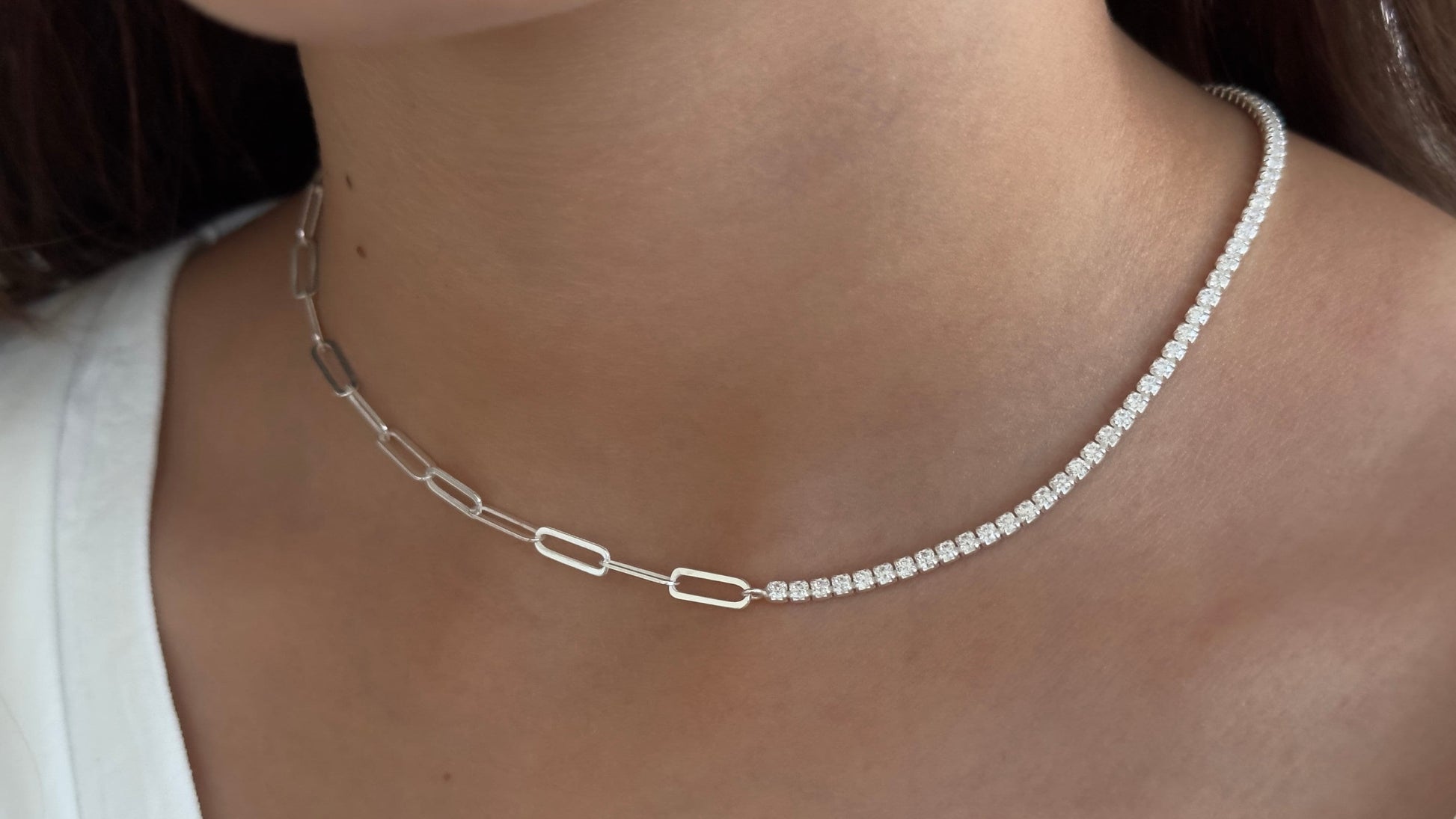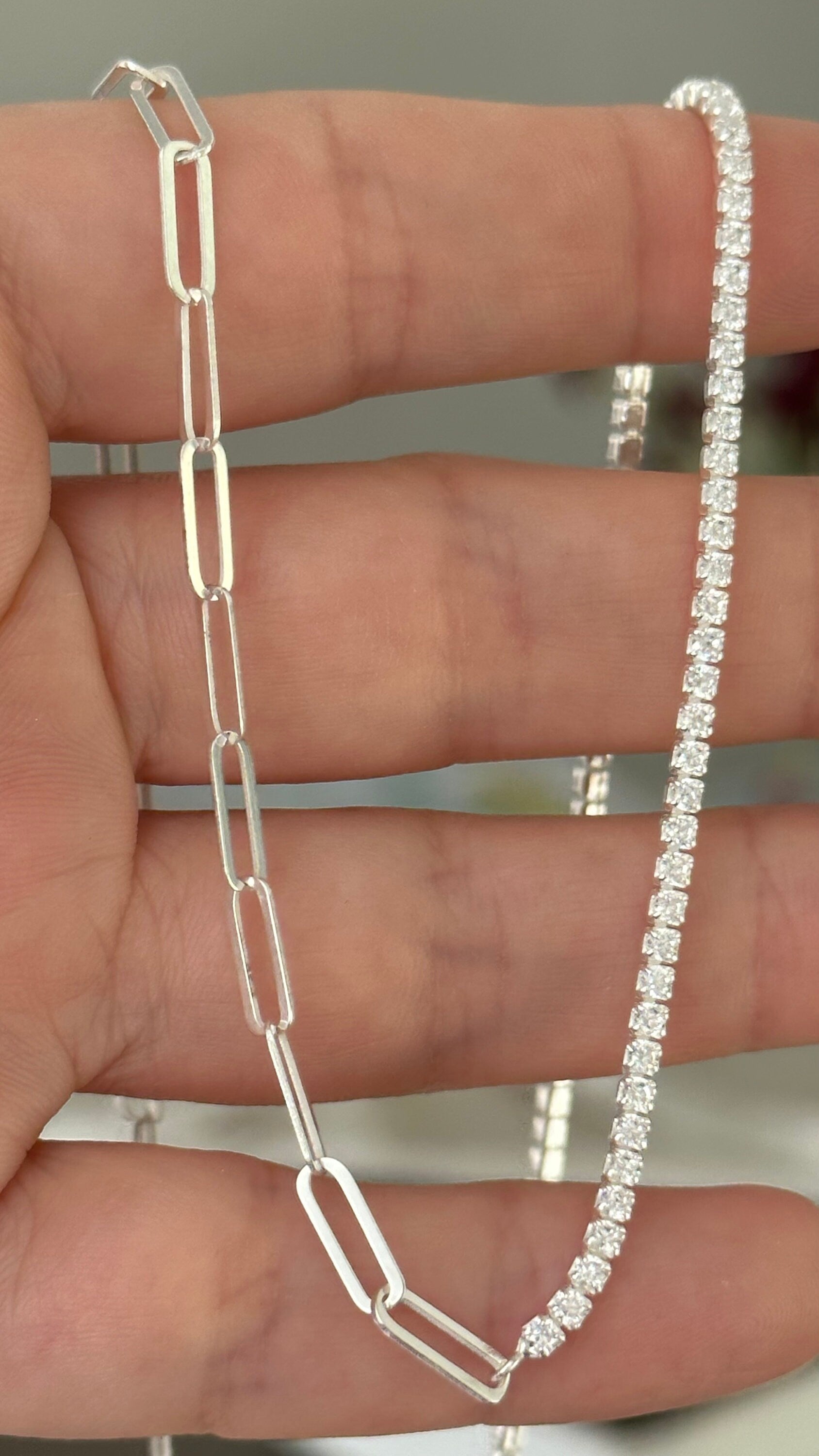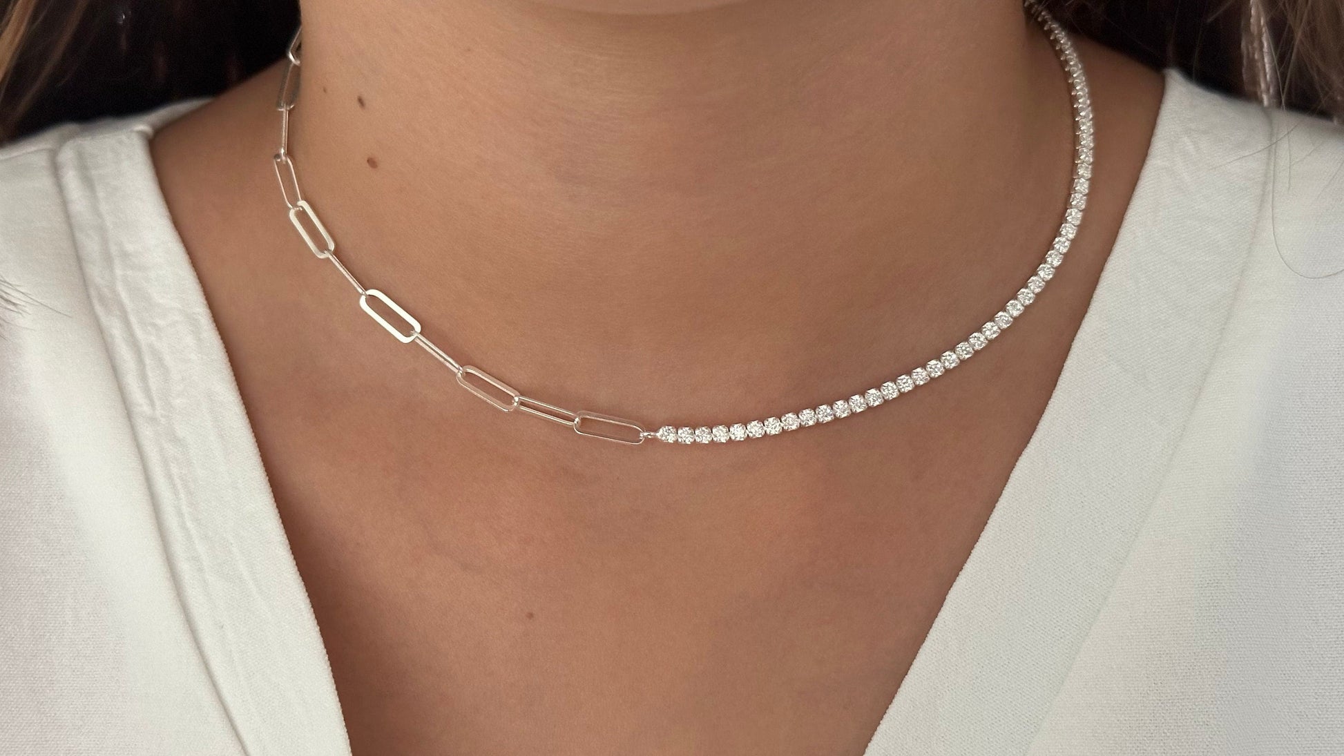 Half Tennis Half Link Chain Necklace Choker, CZ Tennis Necklace, 2mm Diamond Necklace, Link Chain Necklace, Tennis Jewelry, 925 Silver