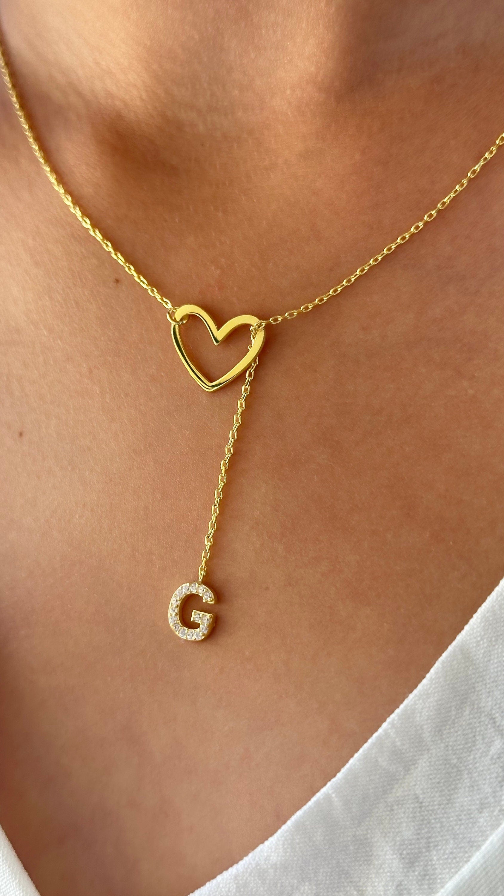 Initial Heart Lariat Necklace, Personalized Y Initial Heart, Lariat Y Necklace, CZ Stone Dangle Letter, Initial Drop Chain,Personalized Gift