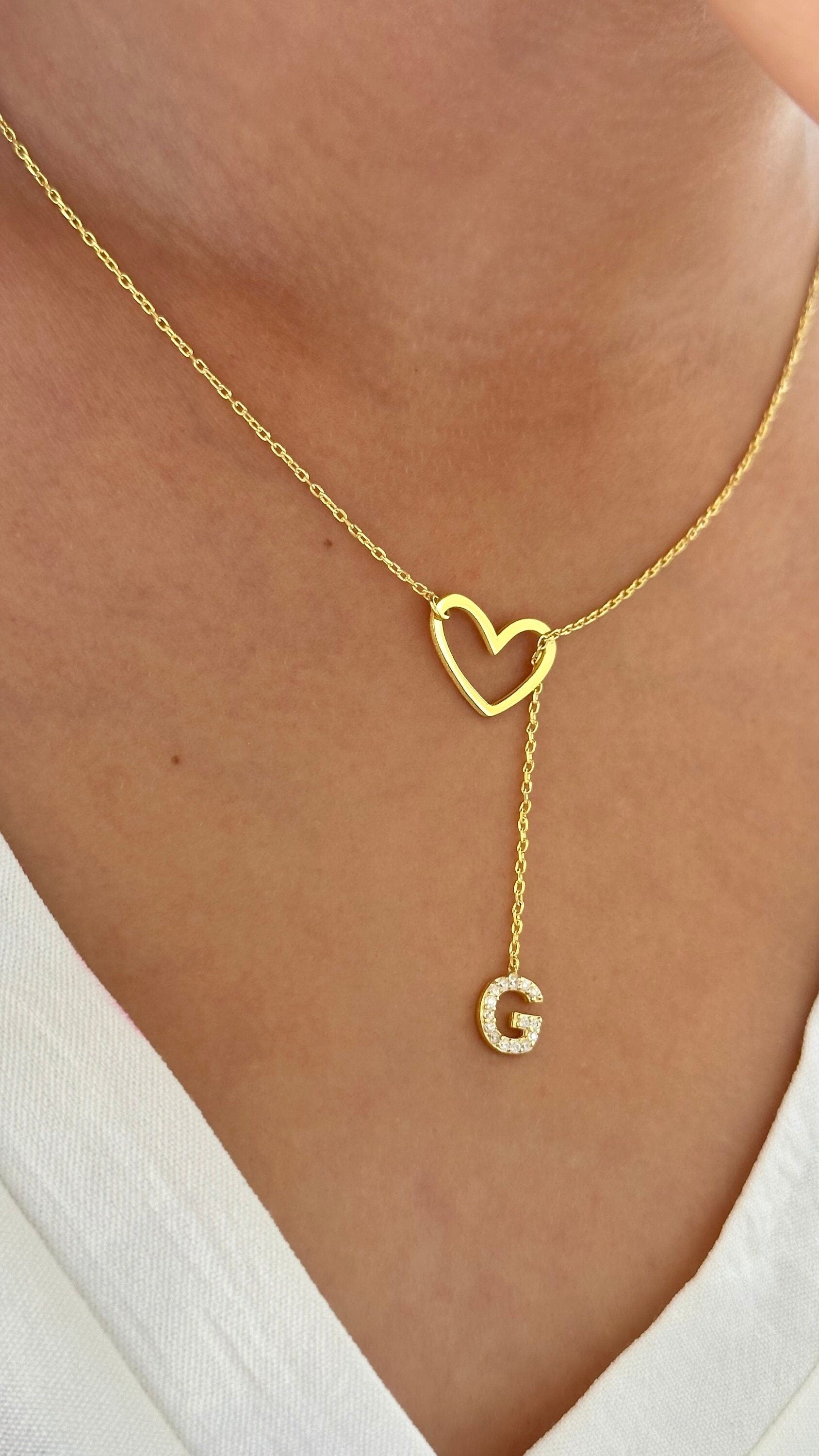 Initial Heart Lariat Necklace, Personalized Y Initial Heart, CZ Stone Initial Necklace, Lariat Initial Drop Chain, Couple Name Hearts, 925 Sterling Silver,