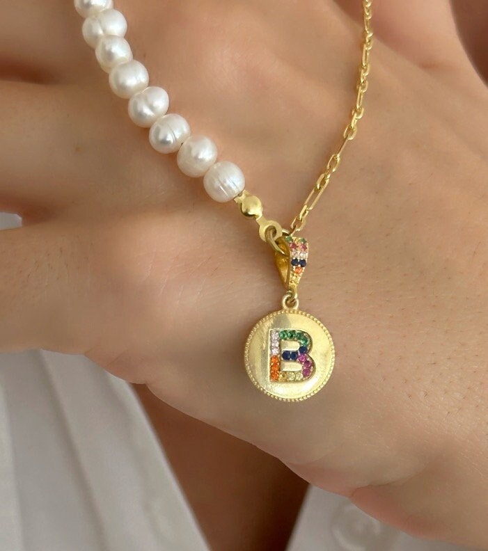 Initial Pearl Necklace, Half Pearl Half Chain, CZ Necklace, Pearl Choker, Personalized Gift, Freshwater Pearl, Christmas gift, 925 Silver