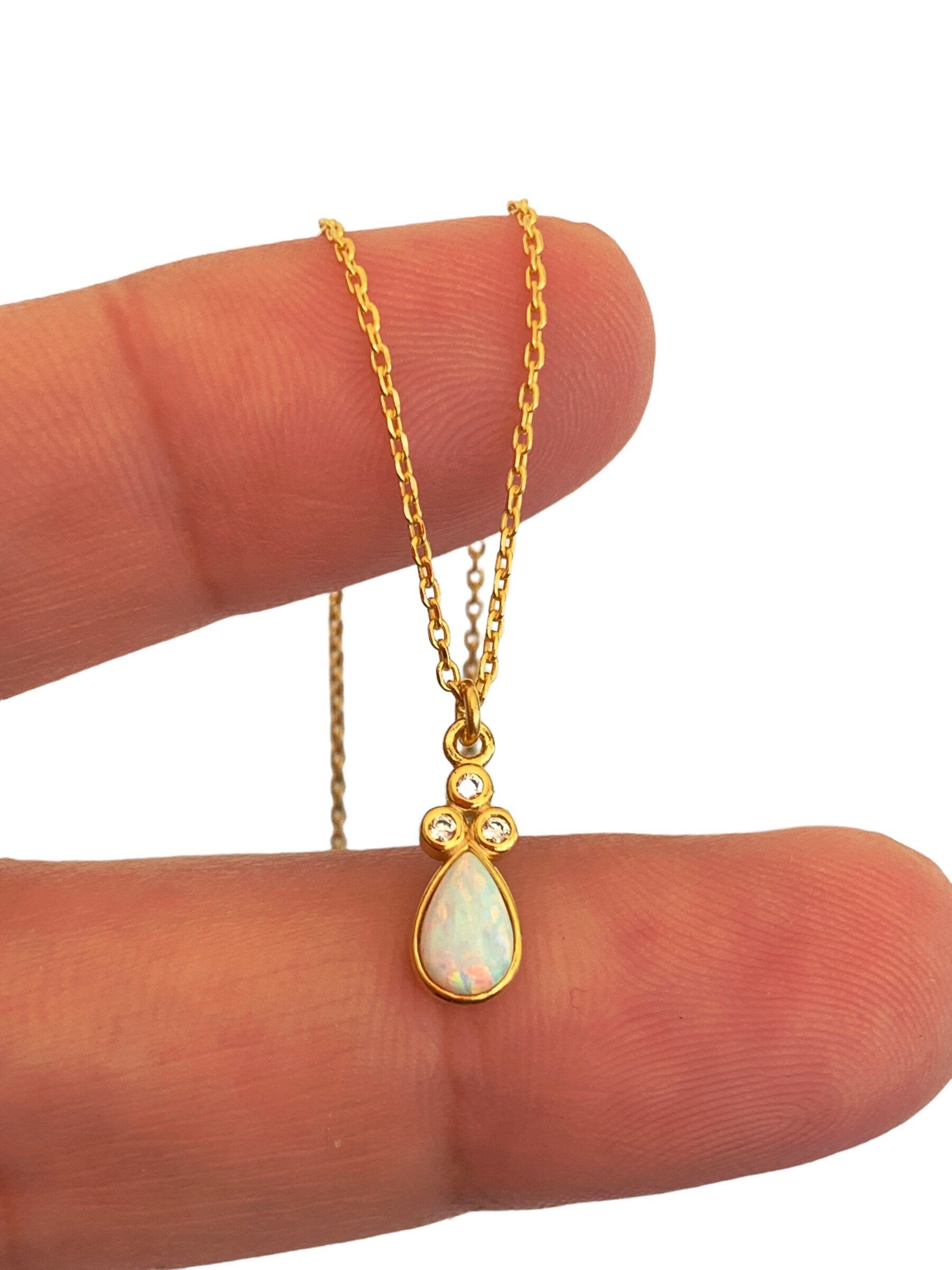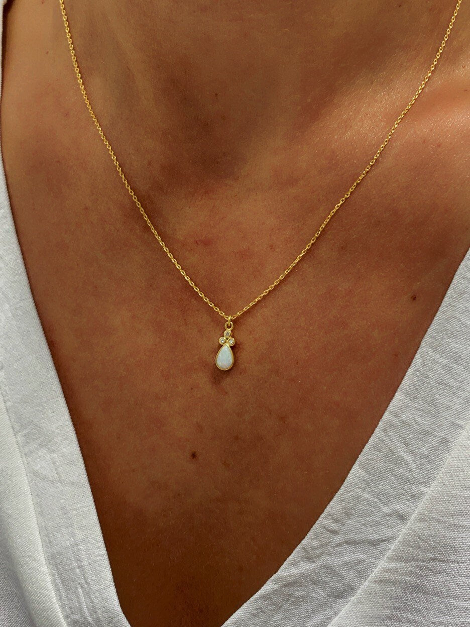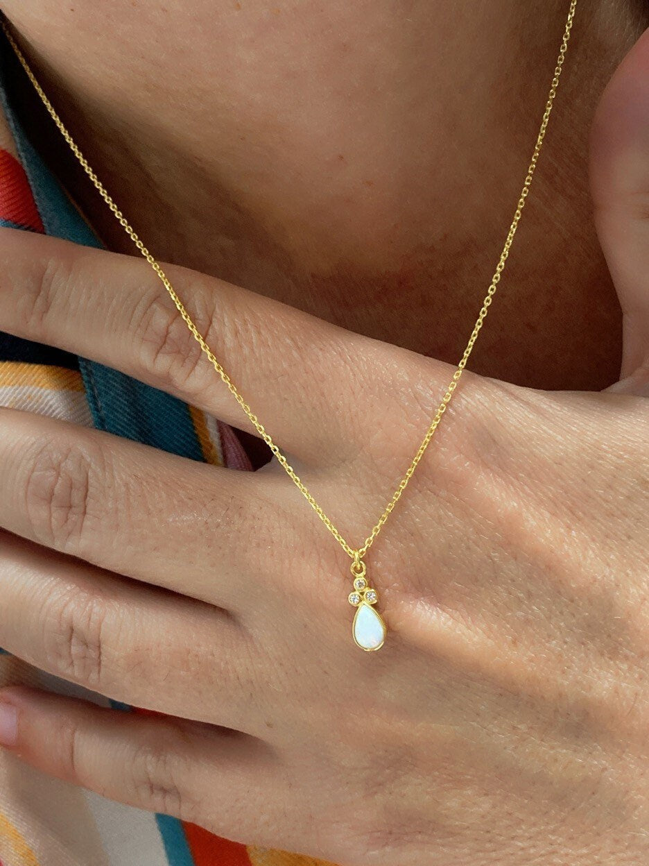 This minimal opal drop necklace is great gift for a woman or addition to your jewelry collection. You can wear this white opal birthstone jewelry alone or layer with other pieces. 14 K Gold plated over 925 Sterling Silver.