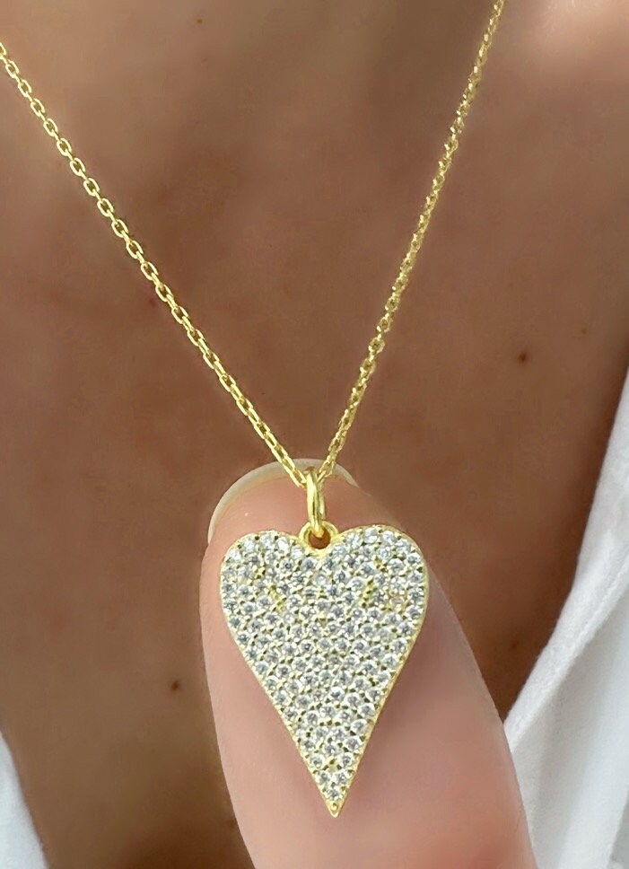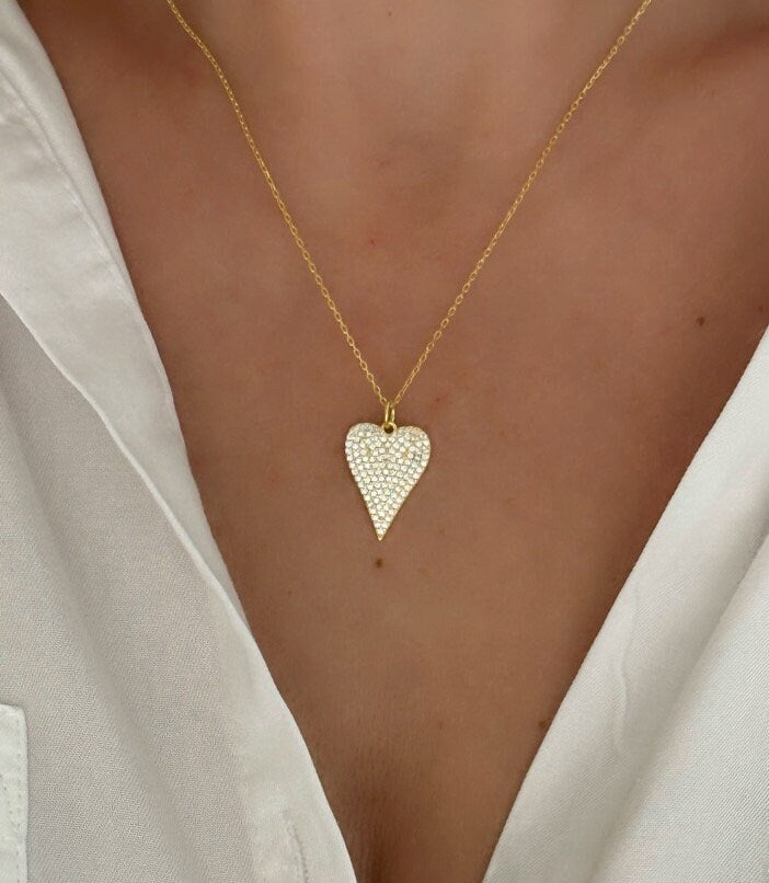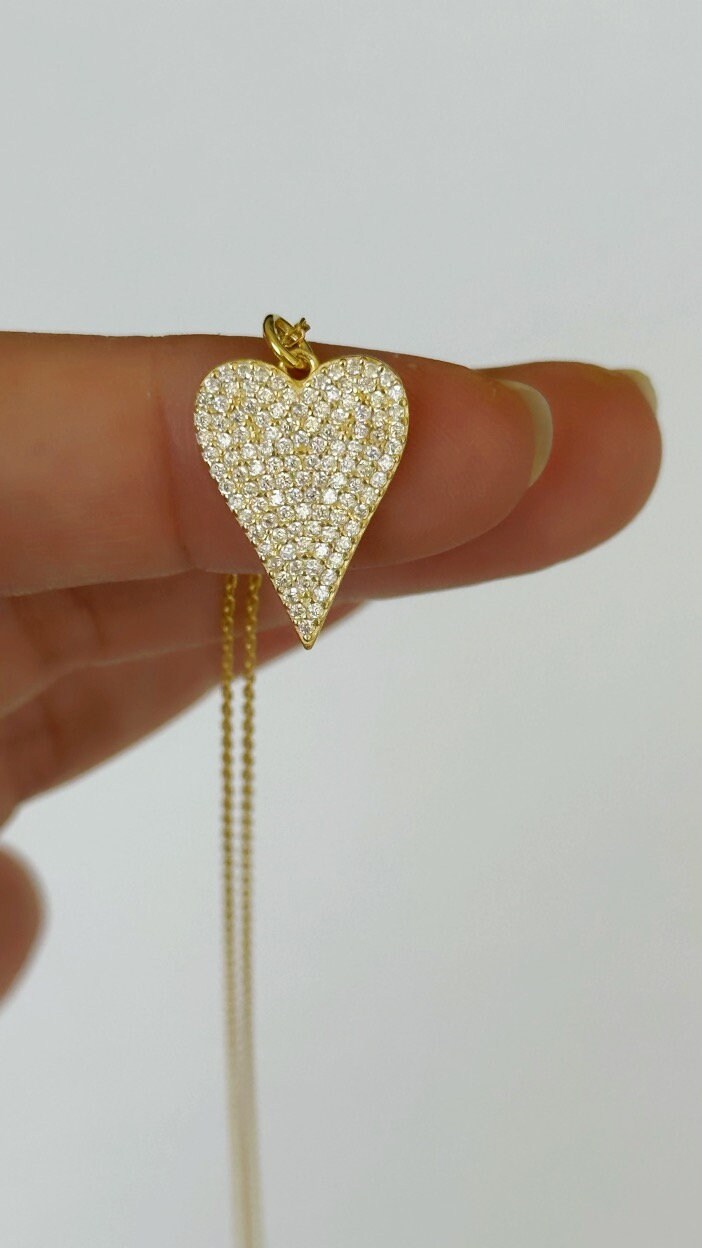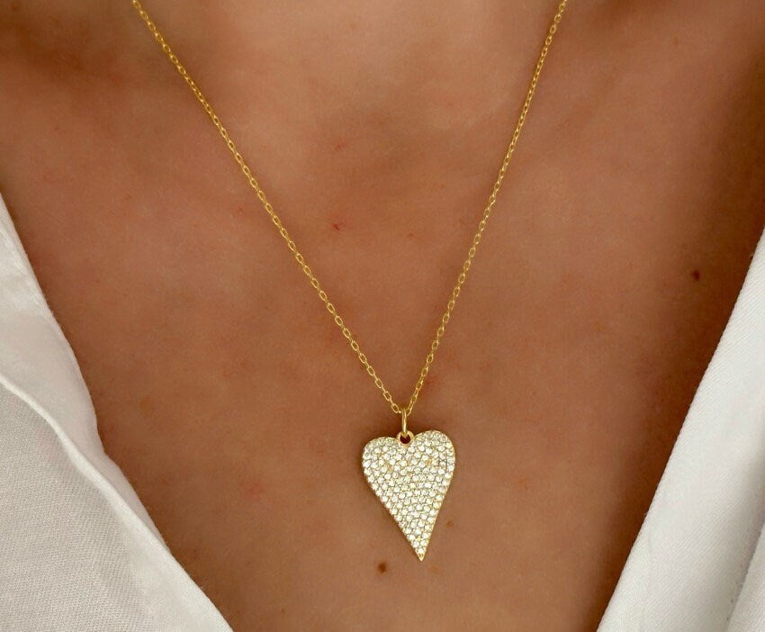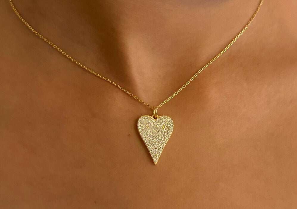 Pave Diamond Heart Necklace, Elongated Pendant Necklace, Love Necklace, Big Heart Necklace, CZ Necklace, Gemstone Necklace, Layering Necklace, 925 Sterling Silver Handmade Jewelry