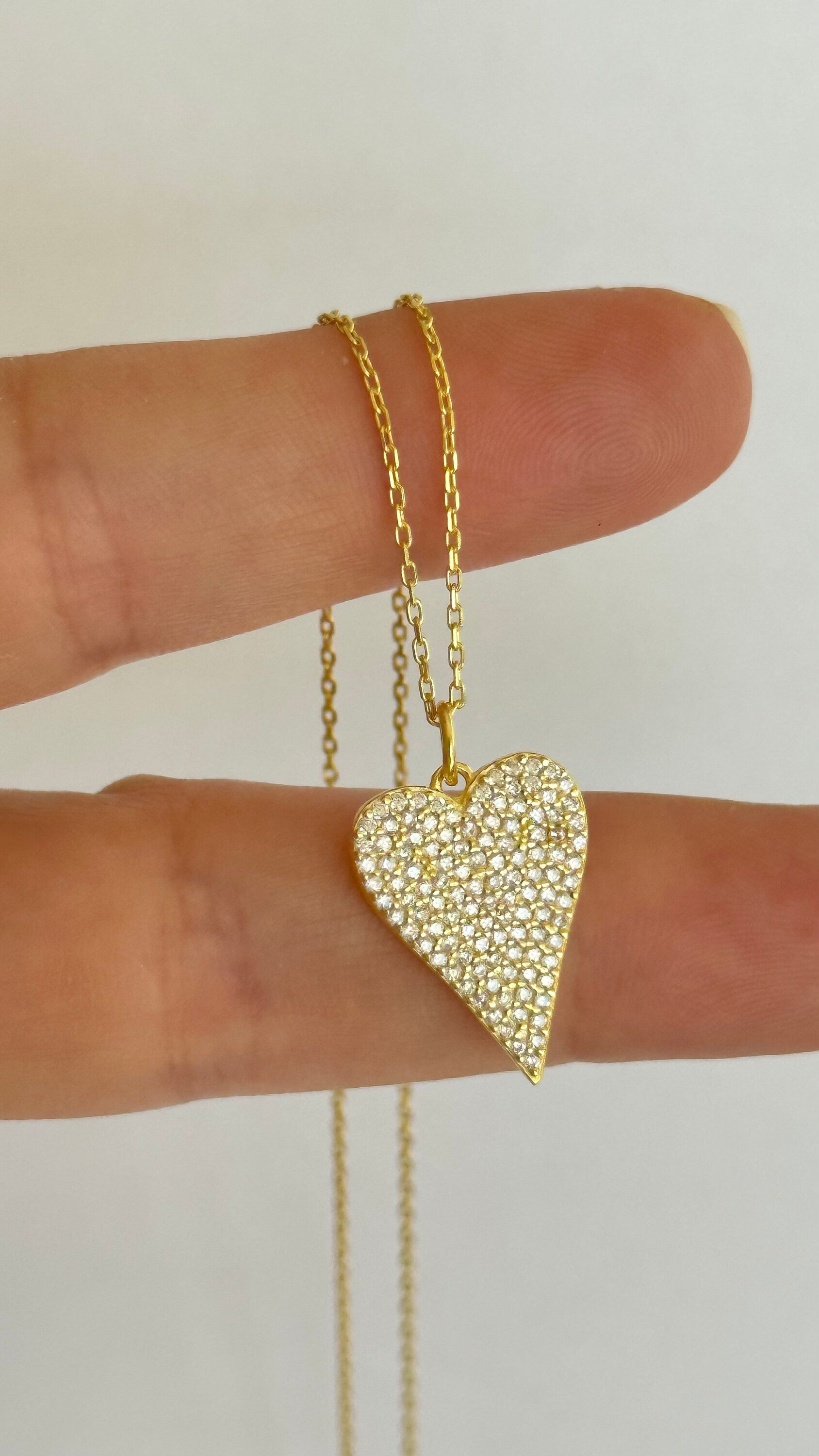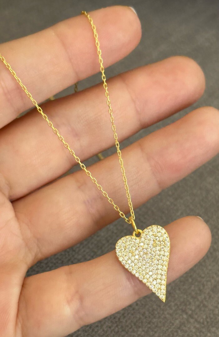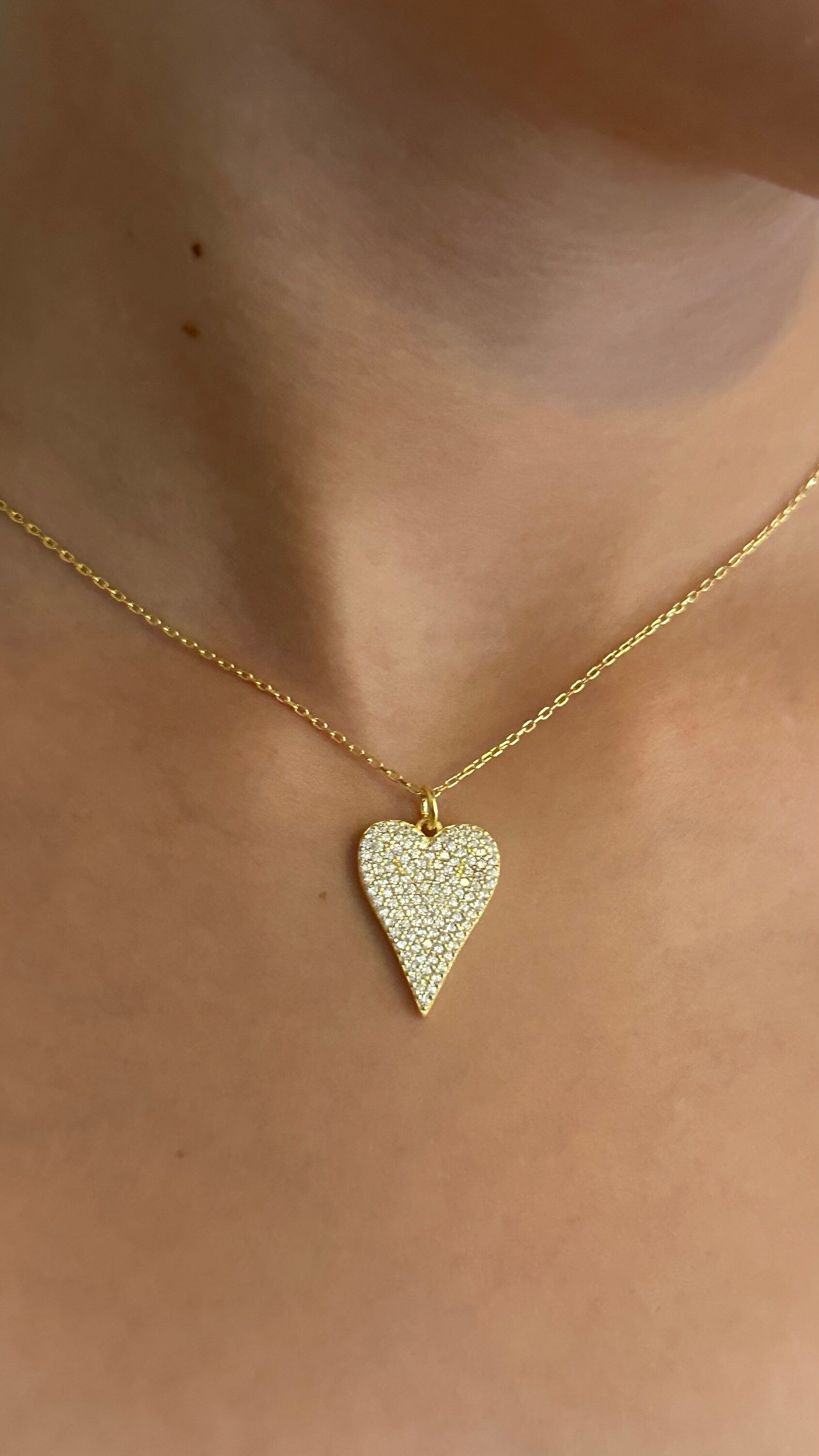 Pave Diamond Heart Necklace, Elongated Pendant Necklace, Love Necklace, Big Heart Necklace, CZ Necklace, Gemstone Necklace, Layering Necklace, 925 Sterling Silver Handmade Jewelry