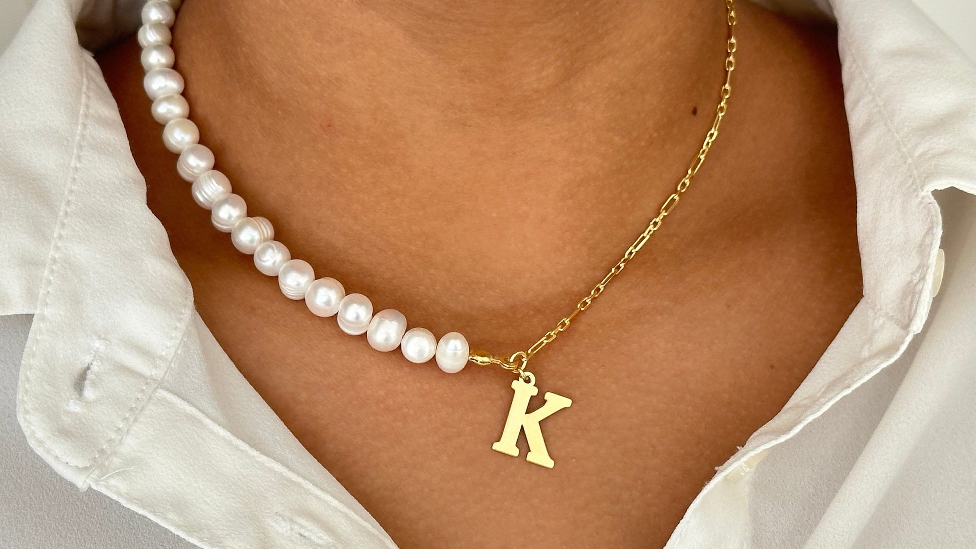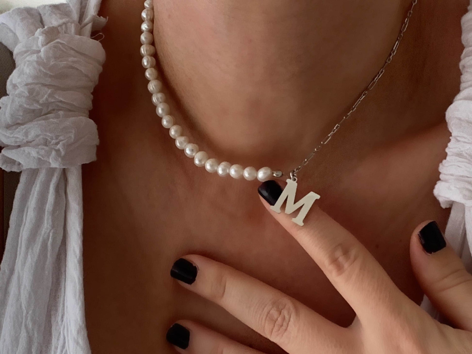 Half Pearl Half Chain Necklace, Initial Pearl necklace, Pearl Name Necklace, Pearl Choker, Letter Pearl Necklace, Personalized Pearl Necklace, Custom Necklace, Freshwater Pearls, T Paperclip chain necklace, Real pearl necklace, Gift for Girlfriend, Trendy Necklace