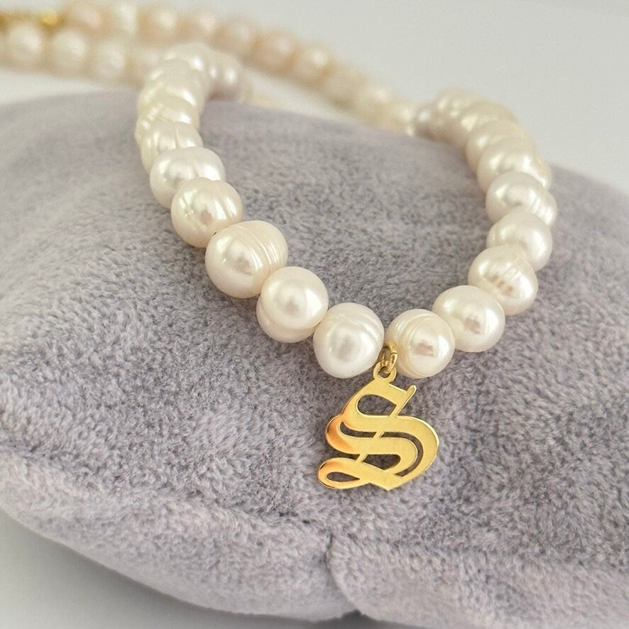 Personalized Initial Pearl Necklace, Old English Initial Necklace, Custom Pearl Necklace, Personalized Gifts, Initial Jewelry, 925 Silver