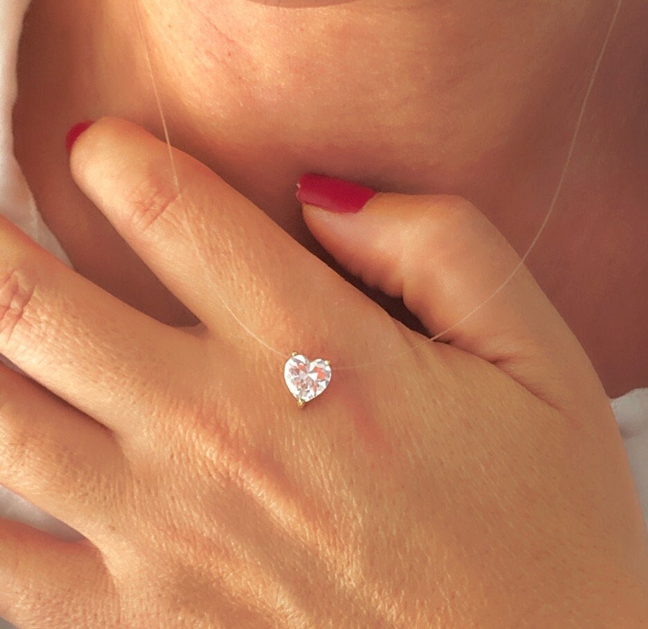Princess Diamond Necklace- Invisible heart necklace made of thin thread of transparent nylon flush with the neck - Crystal diamond pendant is Cubic Zirconia Gemstone 925 Sterling Silver - This Floating necklace would be a great gift for woman or addition to your dainty jewelry collection.