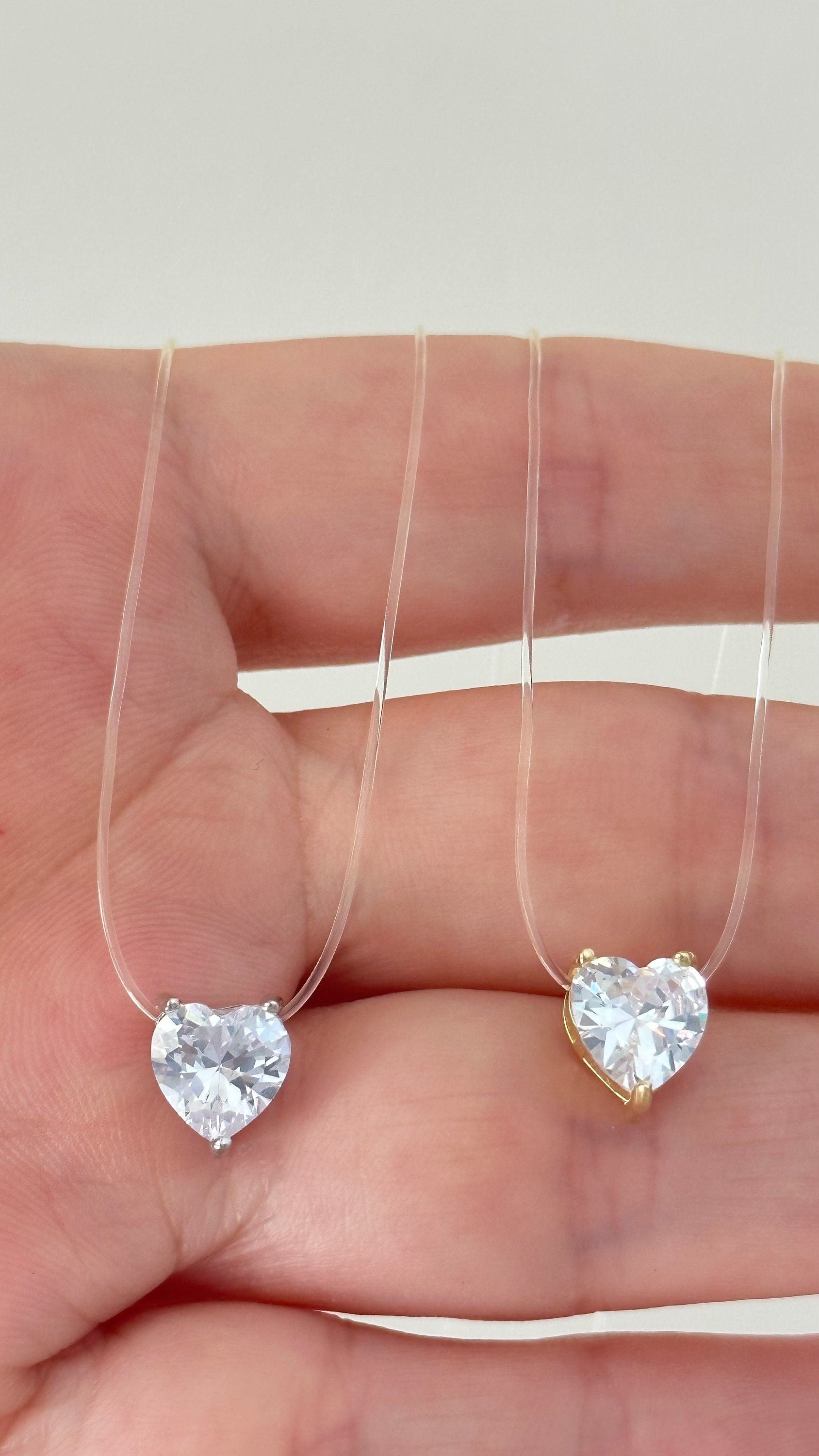 Princess Diamond Necklace, Invisible Necklace with Crystal Heart, Illusion Necklace, Floating Heart Necklace, CZ Necklace, Minimalist