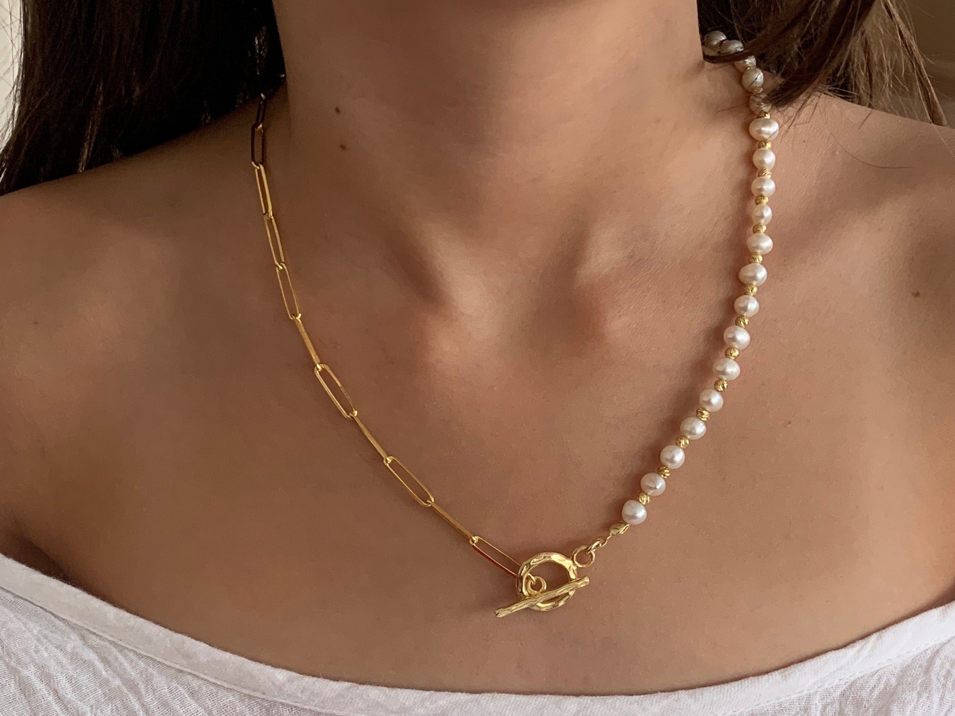 Trendy Necklace, Valentines day gift, Girlfriend Gift Idea, Bead Necklace, Half Chain Half Pearl Necklace Choker, Dainty Gold Layering Pearl Necklace, Toggle Necklace, Gift for Girlfriend